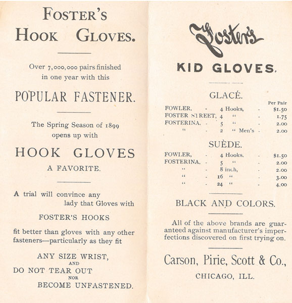 First edition. 6" x 6" beautifully designed advertising pamphlet that folds to four 6" x 3" panels. The front panel shows a lithograph picture of an elegant lady holding a Foster Hook Glove while wearing the other glove. The following is stated "My Lady's Glove." The rear panel shows a vase with pink roses and a pair of gloves. The following is stated "Foster's Hook Gloves. For Sale by Carson, Pirie, Scott & Co., Chicago, Ills." Describes the features of the gloves to include colors and pricing. The Carson, Pirie, Scott & Company was founded in 1854 as an American department store, which grew to over 50 locations, primarily in the Midwestern United States. Sold to the holding company of Bon-Ton in 2006, but still operated under the Carson name. Minor wear to the top fore-edge else fine.