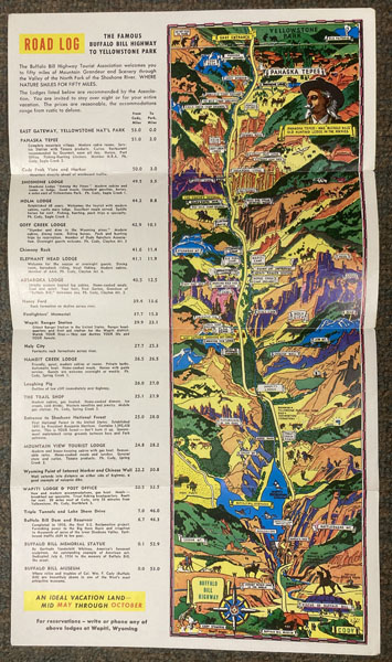 16" x 9" sheet folded to 8 panels. All panels are printed in color. Cover panel offers illustration of Wyoming with mountains in the background and buffalo in the foreground. One panel offers general information about Yellowstone, and 2 panels offer color photographs of sights one will see while traveling the Buffalo Bill Highway. Opposite side offers 4 color panels showing a pictorial bird's-eye map of the route from the East entrance of the Park to Cody, Wyoming. To the left of the map is a detailed road log with mileage splits (both ways) and names of the suggested stops (including lodging) and descriptions. Light soiling and with light wear to the extremities. Very good.
