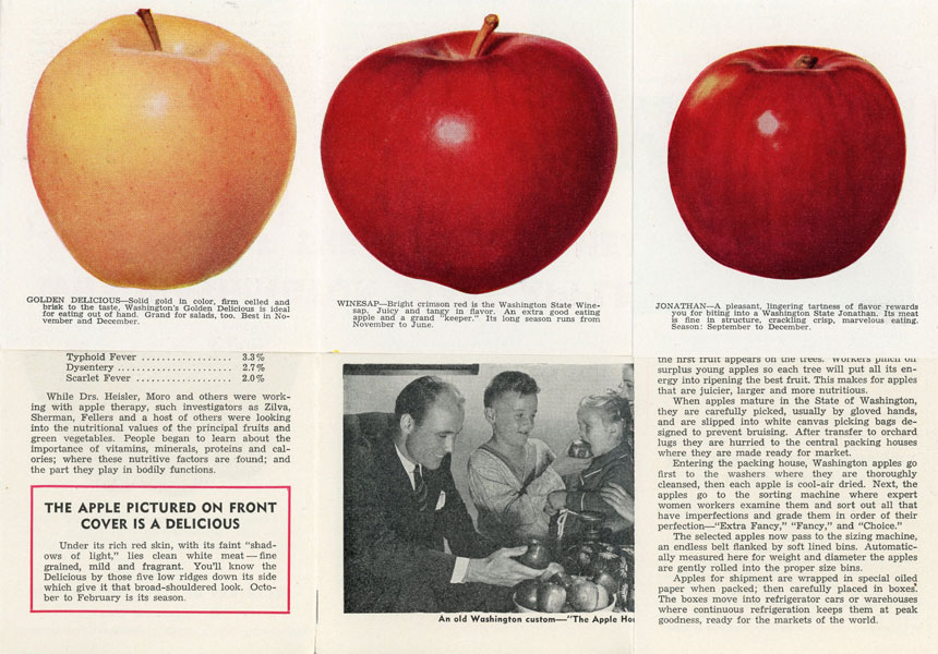 Five-fold brochure, 3.75" x 8" unfolding to 12.5" x 18.75". Illustrated with half-tone photographs and five life-size color images of different varieties of apple. The primary focus of this brochure is the health benefits of eating apples, which are touted for their vitamin and mineral content, defense against intestinal ailments, and utility in dieting. There are also sections describing why Washington is an ideal apple-growing locale, the development of irrigation, and how apples travel from tree to market. A small map highlights six apple-growing regions in the state. One small split along a fold; else a very good copy.