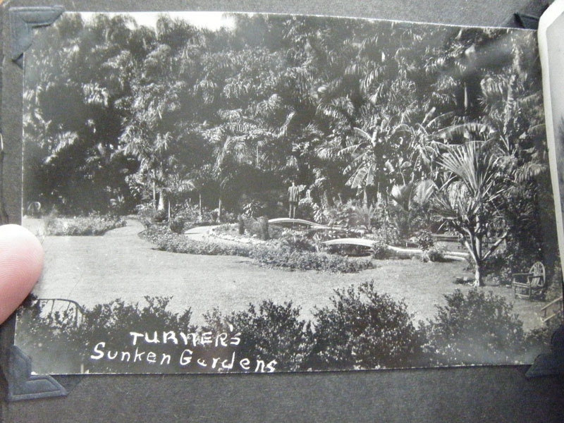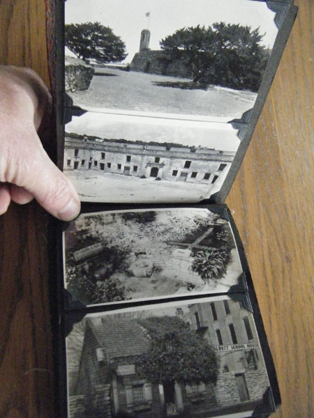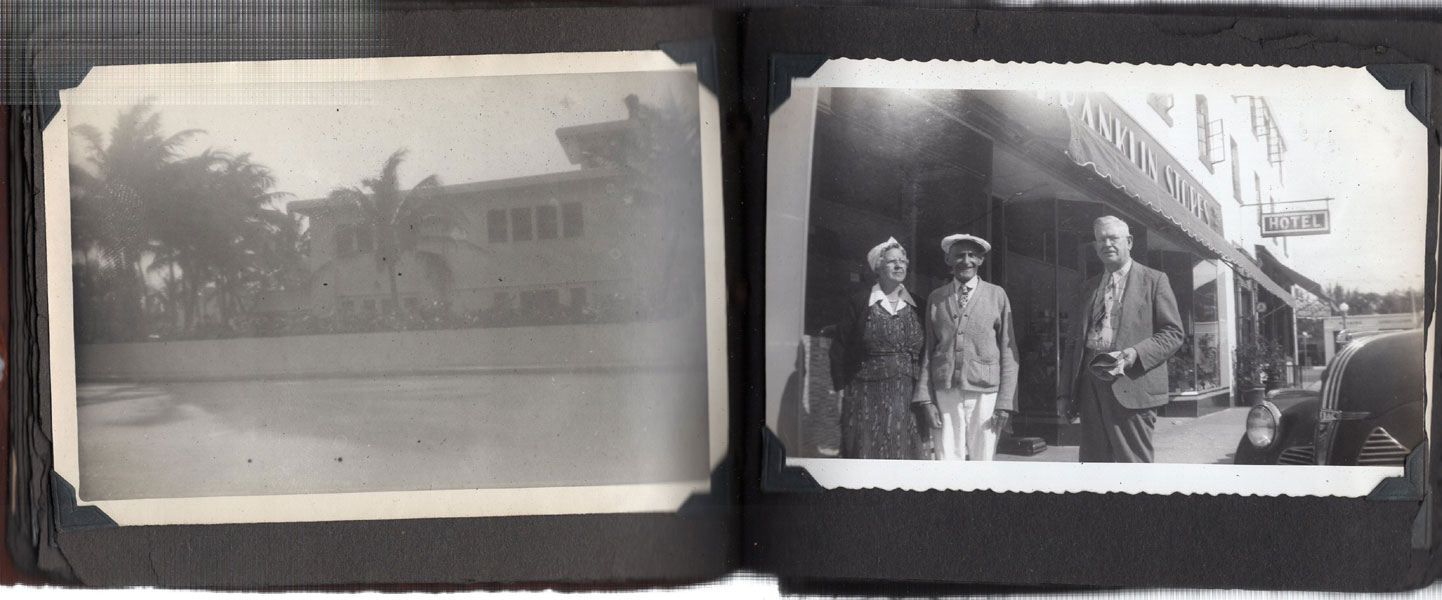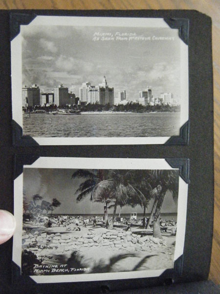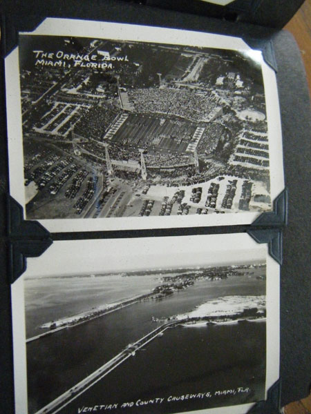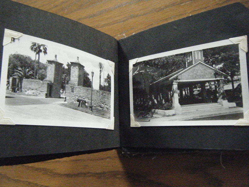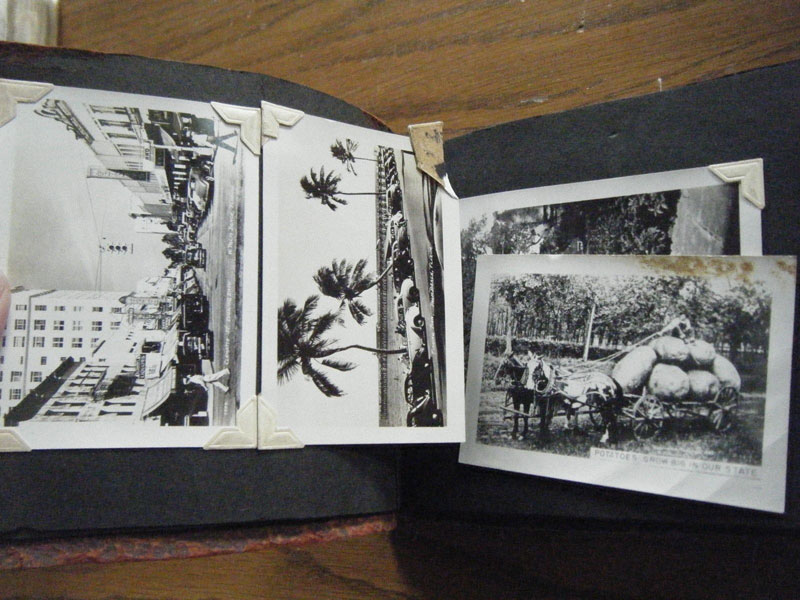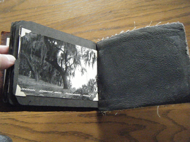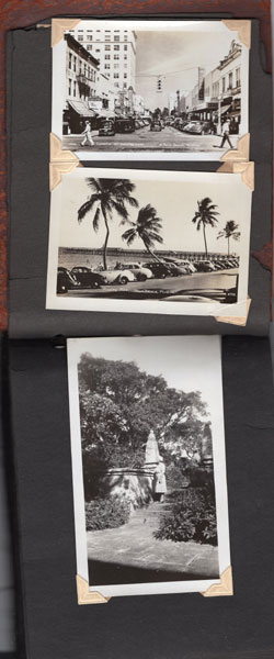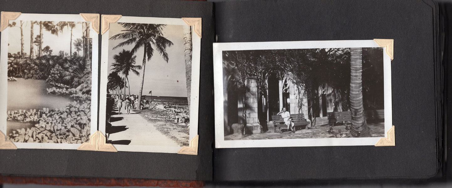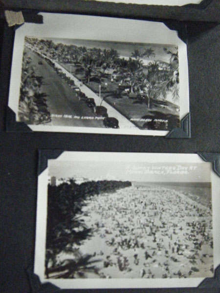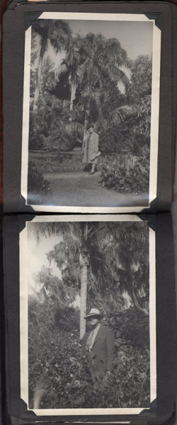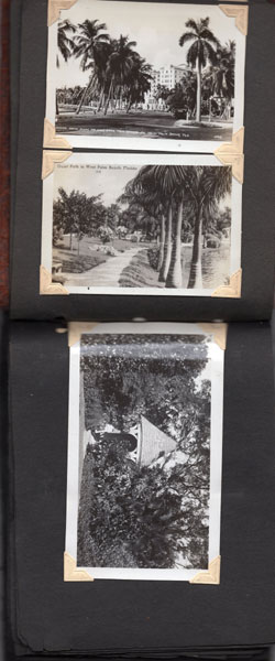 5" x 6 1/2" in brown flexible leather with title ("Snap Shots. Souvenir of W. Palm Beach, Fla.") in silver. 48 pp. offering 62 snap shot images and 2 real photo postcards. Photographs range in size from 2 1/2" x 3 1/2" to 3 3/4" x 5 1/2," though most measure approximately 2 1/2" x 3 1/2." Photographs include scenery, street scenes, beach scenes, park scenes, an Indian Village, Turner's Sunken Gardens, Bethesda-by-the-Sea church, Spanish moss, oldest school house in the U.S., located in St. Augustine, 6 pictures of Miami to include the Orange Bowl, Venetian and County Causeways; Cypress Gardens, 4 pictures of Silver Springs, etc. Individuals in pictures are not identified. The smaller (2 1/2" x 3 1/2") photographs appear to have been a part of a set as most are identified at bottom edge. Picture very good to fine, some with creases to corners. Covers with light wear to extremities and spine. Most pages have chipping to corners or edges. Very good.