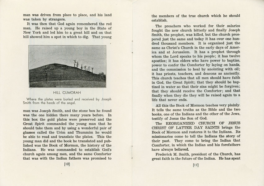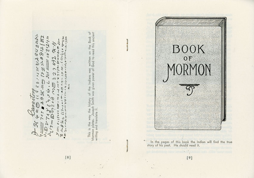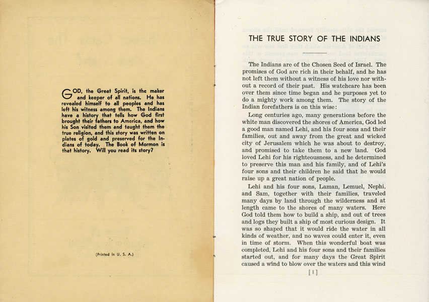 7 1/2" x 5 1/4" in pictorial wrappers with illustrations of an Indian's profile and the title printed in red and black. 13 pp. Illustrations. "God, the Great Spirit, is the maker and keeper of all nations. He has revealed himself to all peoples and has left his witness among them. The Indians have a history that tells how God first brought their fathers to America, and how his Son visited them and taught them the true religion, and this story was written on plates of gold and preserved for the Indians of today. The Book of Mormon is that history." "The Indians are of the Chosen Seed of Israel. The promises of God are rich in their behalf, and he has not left them without a witness of his love nor without a record of their past. His watchcare has been over them since time began and he purposes yet to do a mighty work among them." Light soiling and with light wear to the extremities. Very good.