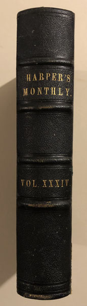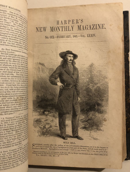 First edition. Thick 8vo. Three quarter leather and marbled paper over boards, marbled endpapers, p.273-285, double column, illustrated. Story appears in Harper's New Monthly Magazine No CCI, Vol. XXXIV, February, 1867. Entire volume contains issues for Volume XXXIV, December, 1866, to May, 1867. This is the preferred binding with "Volume XXXIV" preferred to "Volume 34" and the marbled endpapers are preferred to the plain endpapers. The author met Wild Bill in Springfield, Missouri in the summer of 1865, and relates firsthand accounts of stories Hickok told him. Included in the stories is the "M'Kandlas" fight, the "Tutt" duel, and two Civil War scouting stories. Also included in the volume are "Davy Crockett's Electioneering Tour", The Virginians In Texas",a few Civil War stories including "Heroic Deeds Of Heroic Men", and Personal Recollections Of The War", and much more. Under the section titled "Current Events" is a mention of the Fort Philip Kearney massacre along with the number of dead and that Col. Carrington was arrested for neglect of duty. Also in the December issue in this volume appears FORTY-THREE DAYS IN AN OPEN BOAT on page 104 which is Mark Twain's first nationally published writing. He is listed as "Mark Swain" in the table of contents. Very good, tight copy of a difficult title.