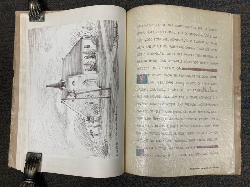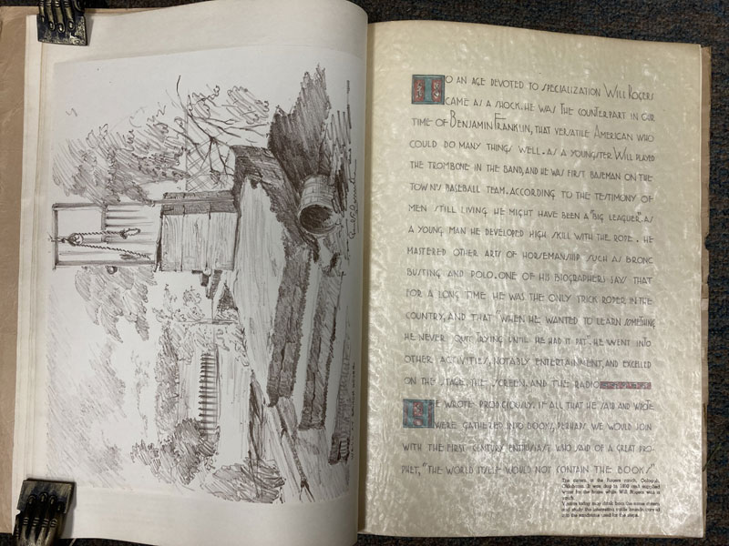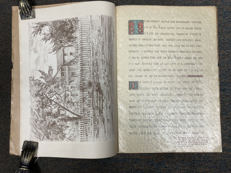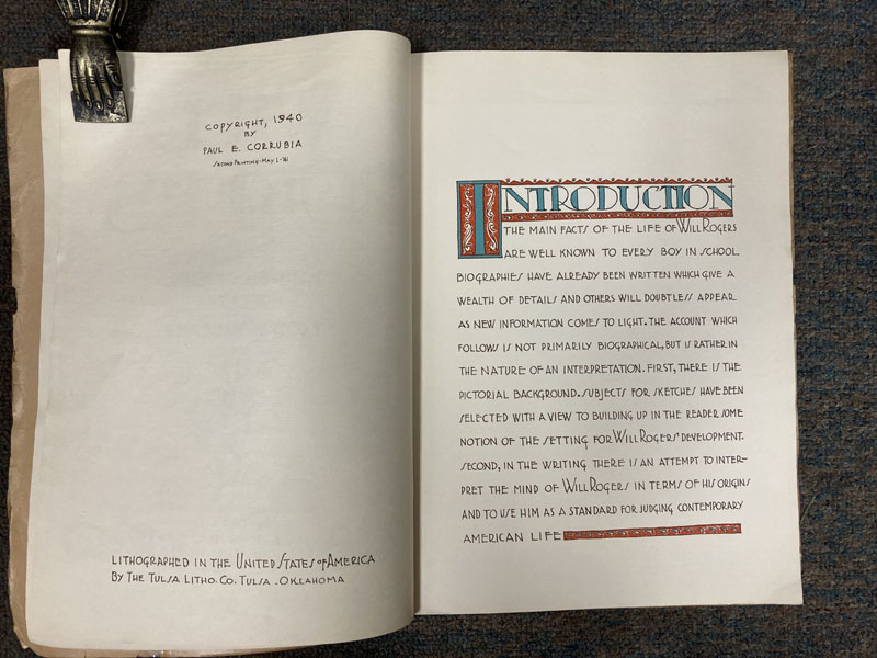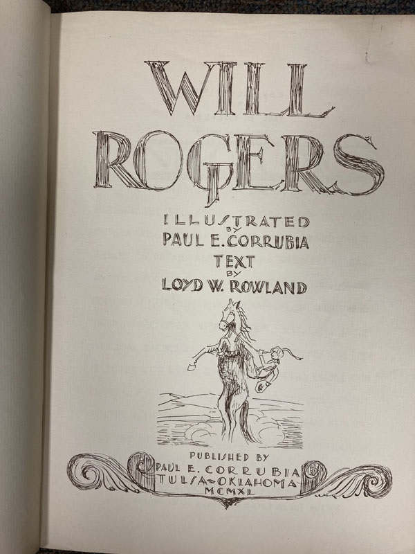 First edition, second printing. Folio. 15" x 11" pictorial & decorated, stiff wrappers, n. p. [18] pp. printed one side & 16 pp. of 12" x 10" illustrations done by Paul E. Corrubia and each drawing protected by a printed tissue guard]. Decorative motifs on text pages are hand-colored. A biographical tribute to the life and contributions of Will Rogers. Born as a citizen of the Cherokee Nation in Indian Territory, Will Rogers was an American vaudeville performer, actor, and humorous social commentator. As an entertainer and humorist, he traveled around the world three times, made 71 films, and wrote more than 4,000 nationally syndicated newspaper columns. By the mid-1930s, Rogers was hugely popular in the United States for his leading political wit and was the highest paid of Hollywood film stars. He died in 1935 along with aviator Wiley Post when their small airplane crashed in northern Alaska. An uncommon work on Rogers, arguably one of the world's best-known celebrities in the 1920s and 1930s. The subject of the sketches provide images in Oklahoma associated with Will Rogers. "...in the writing, there is an attempt to interpret the mind of Will Rogers in terms of his origins and to use him as a standard for judging contemporary American life." - Introduction. Tiny nicks and creases to the fore-edges, two tiny edge repairs using cellophane tape, wear to the spine ends with the interior clean and tight. Overall a very good, serviceable copy.
