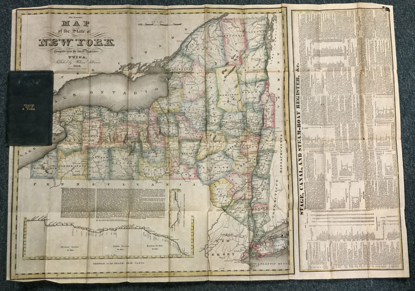 Engraved by V. Balch & C. Stiles. Folded 28 1/2" x 20 1/8" colored map housed in 3 1/4" x 5 1/2" green leather-covered soft boards. Besides the map of the state, there is an inset "Profile of the Grand Ere Canal" and text describing the Erie, Champlain, Oswego, Seneca, Delaware and Hudson, and Morris canals. The right side contains nine 7 3/8” long columns with the heading, "Stage, Canal, and Steamboat Register, &tc." Those columns contain information on mileage between cities; stage routes; Erie Canal racket boats; Hudson River and Lake Erie steamboats; the population of counties as of 1825; colleges in the state of New York; Trenton Falls; rates of tolls on canals; a description of Utica; and the Welland Canal in Upper Canada. Map has a small 1/2" tear at upper right corner but not affecting any printing, minor teats at a few fold creases, covers lightly soiled and rubbed else very good.