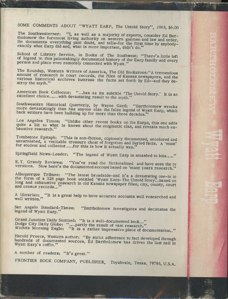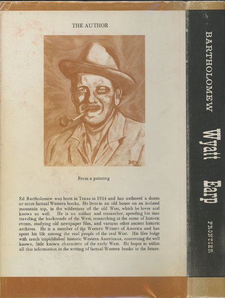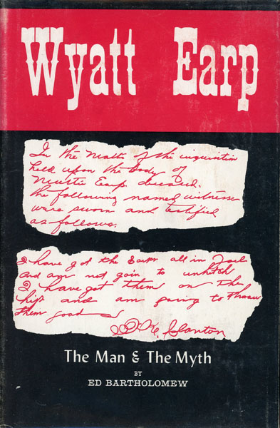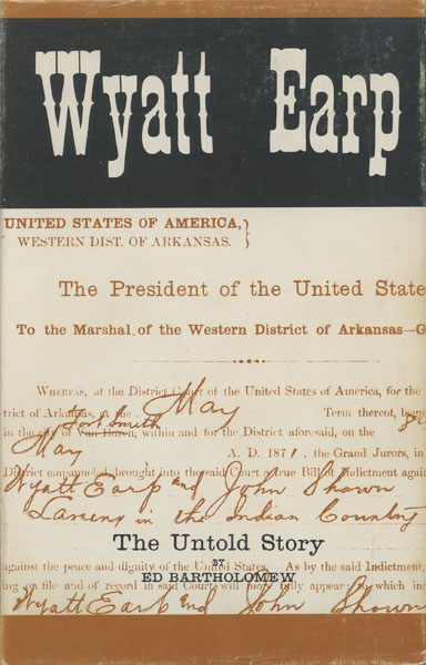 First edition. Two Volumes. Each volume limited to 1,000 copies. 8vo. Volume I: Cloth, 328 pp., bibliography, acknowledgments. Fine tight copy in lightly rubbed dust jacket with light wear to spine ends, corners and extremities. Six Guns 156 says, "An account of Wyatt Earp's Kansas and Dodge City years. The author has unearthed some surprising material from the records. The book is an important addition to the Earp controversy." Together with Volume II: WYATT EARP 1879 TO 1882. THE MAN & THE MYTH. A SEQUEL TO "THE UNTOLD STORY." Toyahvale: Frontier Book Company, 1964. First edition. 8vo. Cloth, 335 pp., chronological bibliography, portraits, plates. Fine in dust jacket, sunned on the spine, light wear to spine ends, corners and with a tiny chip to top edge of rear cover. Six Guns 157 says, "The second volume of the author's study of Wyatt Earp, dealing with his Arizona years. Many of the outlaws of that period are also discussed, among them Dave Rudabaugh, Jesse Evans, Russian Bill, Frank Stillwell, Pete Spence, Johnny Ringo, Frank Leslie, Kit Joy, the Clantons, and the McLaurys." In a back pocket there is a typewritten letter on Frontier Book Company stationary dated June 30, 1958, SIGNED by Bartholomew. This two volume set is one of the major works on Earp and has become scarce, especially so in the hardback.