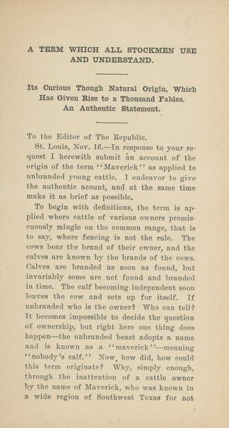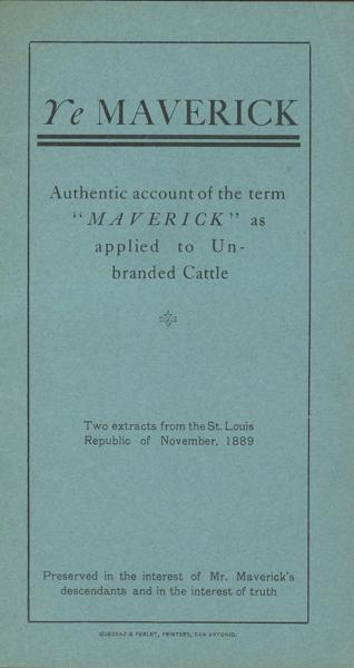 First edition thus. Originally published in the St. Louis Republic newspaper of November, 1889. 6 1/4" x 3 1/2" light blue printed wrappers, n. p. (7 pp.). The origin of the term "maverick" is discussed in two articles by George Maverick and John Henry Brown. A statement on the front cover says "Preserved in the interest of Mr. Maverick's descendants and in the interest of truth." Covers lightly used else a near fine, clean and tight copy. Housed in a cloth clamshell case with titles stamped in white on the spine. Rare item that is seldom offered.