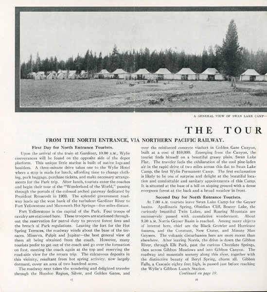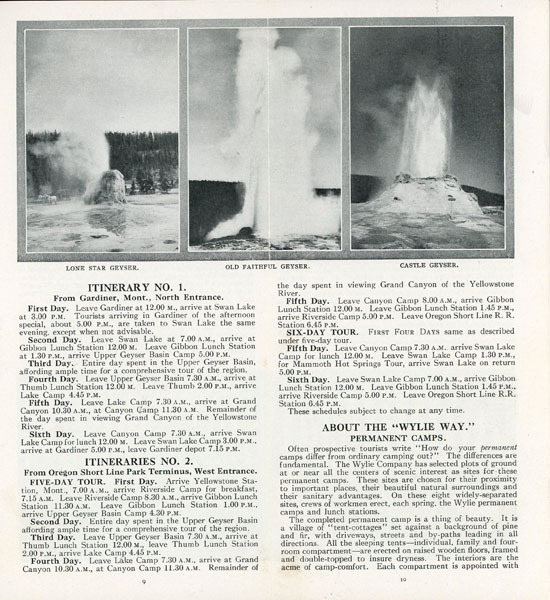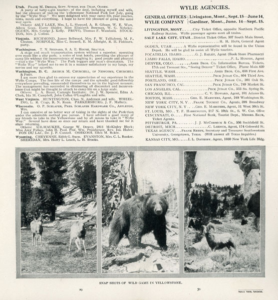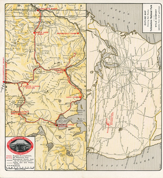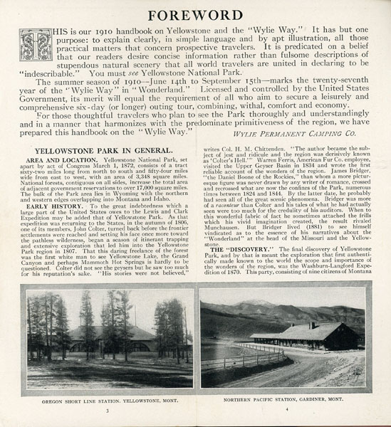 8 1/2" x 8" in pictorial wrappers, folded at center. 32 panels including wrapper. Illustrations. Itineraries. 8" x 4" tourists' map of the park showing regular tourist route, Mt. Washburn trip, government roads, trails and railroads (copyright 1904). 8" x 4" outline map showing rail route to Yellowstone National Park (copyright 1909). Overview of Yellowstone park to include its history, discover, geology, flora and fauna, fishing government, roads, etc. Information about the "Wylie Way" permanent camps. Various tours of the park via different entrances are described. Endorsements by former guests. Scraping and wear to cover panels as well as 1" split to toe of spine. Very good.