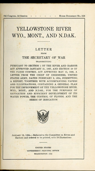 Yellowstone River Wyo., Mont., And N. Dak. Letter From The Secretary Of War Transmitting Pursuant To Section 1 Of The River And Harbor Act Approved January 21, 1927, And Section 10 Of The Flood Control Act Approved May 15, 1928, A Letter From The Chief Of Engineers, United States Army, Dated Februay 9, 1934, Submitting A Report, Together With Accompanying Papers And Illustrations, Containing A General Plan For The Improvement Of The Yellowstone River, Wyo., Mont., And N. Dak., For The Purposes Of Navigation And Efficient Development Of Its Water Power, The Control Of Floods, And The Needs Of Irrigation
