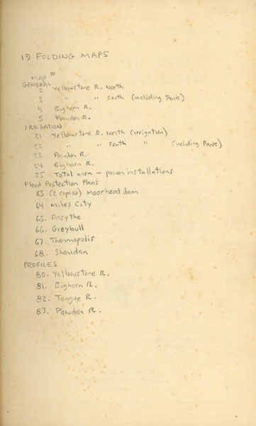 First edition. 8vo. Cloth, titles stamped in black on the spine, vii [3], 176 pp., maps. Thoroughly reviews the general plans for the river, how the Yellowstone River can best provide irrigation for needy areas, plans to protect against floods, and profiles of the involved rivers. All nineteen folded maps are present. Covers lightly soiled else a tight, internally clean copy in very good condition.
