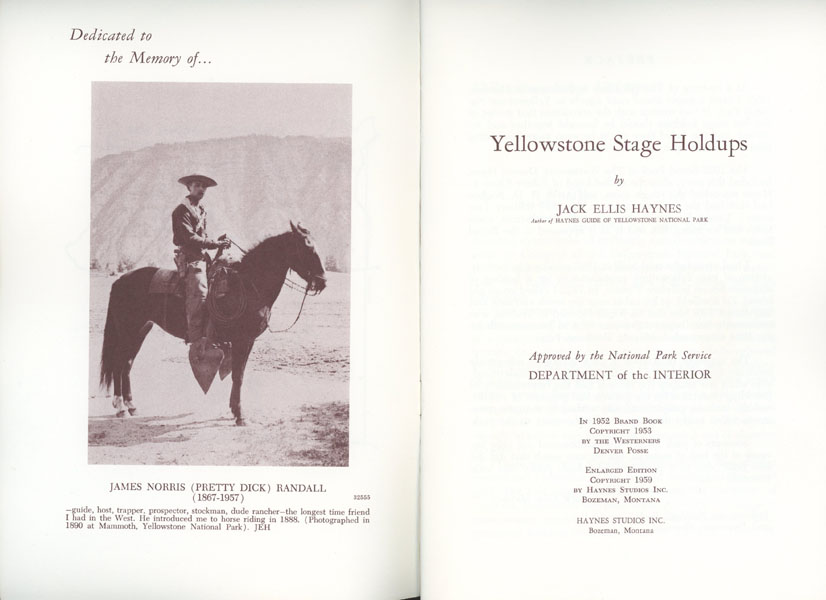Enlarged edition. 8vo. Originally published in 1952 Brand Book by The Westerners, Denver Posse. Pictorial wrappers, 30 pp., preface, illustrated, map, bibliography, index. A history of stagecoach robberies in Yellowstone National Park. Two small scrapes to the front cover else a very good copy.